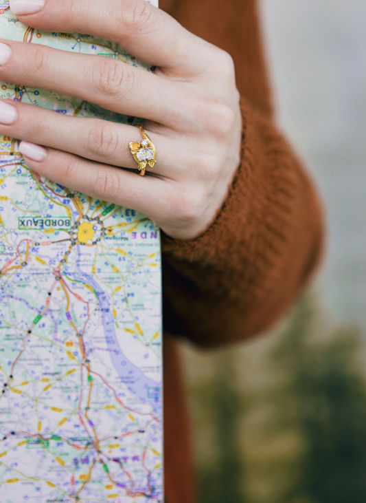 Este anillo de compromiso celebra la belleza orgánica de la Belle Époque. Su forma sinuosa, envolvente, la rama de cerezo en oro con su textura sutil y suave. Los detalles intrincados. Dos brotes de suculentas, una hoja. Un diamante de tres cuartos de quilate (0.75ct), obviamente oval. Otro diamante a su vera, acentuando sus destellos.